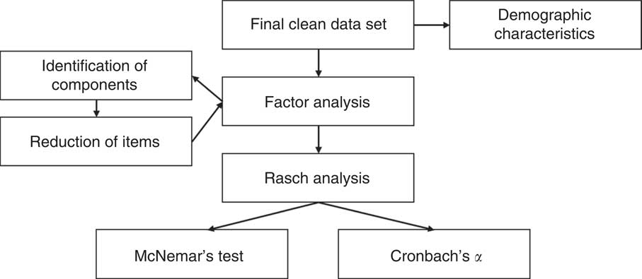 McNemar’s test (cross-tabulation) was used to identify significant differences in the prevalence of food insecurity as identified by the HFNSS and USDA FSSM, and reliability analysis (Cronbach’s α) was used to investigate internal reliability of the HSNSS. Figure 1 summarises the process of statistical testing.