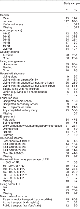 The majority of the cross-sectional cohort was female (87·3 %), born in Australia (73·1 %) and aged 26–55 years (70·9 %). Nearly two-thirds of the participants (66·4 %) were homeowners and 54·5 % reported living with their spouse/partner and children. Almost half had household earnings of more than $AU 80 000 (49·6 %) and 44·8 % had some type of paid work. Nearly 80 % of households had household incomes less than the national median income for the same household type, and one in five households were identified as falling below the FPL. Most households had access to personal motor transport (85·8 %; Table 1).
