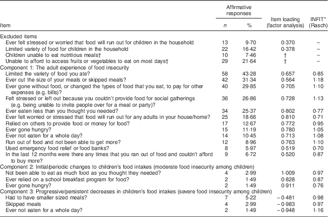 Four items (Table 2) were identified to have loadings below the designated cut-off point of 0·45 and were subsequently removed. Further analysis of the retained items revealed three underlying components which explained 62·1 % of the variance. The retained items loading on to each respective component are summarised in Table 2. Based on these loadings, the components were identified as: the adult experience of food insecurity (component one); initial/periodic changes to children’s food intakes (moderate food insecurity among children; component two); and progressive/persistent decreases in children’s food intakes (severe food insecurity among children; component three).