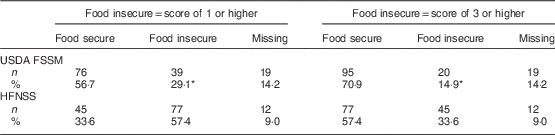 The prevalence of food insecurity identified by the USDA FSSM was approximately half that identified by the HFNSS (Table 3). Using a cut-off value of 1, the prevalence of food insecurity estimated by the USDA FSSM was 29 %, which was significantly lower than the 57 % estimated by the HFNSS (χ 2=10·41, P<0·001). Using a cut-off value of 3, the prevalence of food insecurity estimated by the USDA FSSM remained significantly lower than that estimated by the HFNSS, with prevalence of 15 and 34 %, respectively (χ 2=15·75, P<0·001).