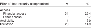 Table 4 Pillars of food security compromised among the convenience sample of adults (n 134) from metropolitan areas of Melbourne, Australia, September 2014–September 2015