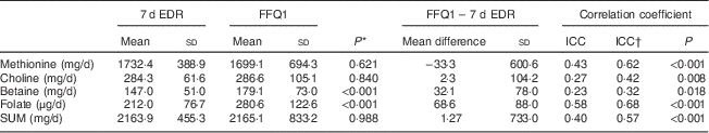 SUM, sum of methyl-group donors; 7 d EDR, 7 d estimated diet record; FFQ1, first administration of the FFQ; ICC, intra-class correlation coefficient.