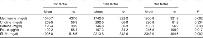 Table 5 Mean intakes of methionine, choline, betaine, folate and SUM estimated with FFQ1 and FFQ2 among Flemish women (n 92) of reproductive age (18–35 years), February–March 2012