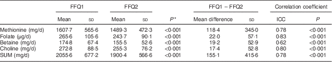 SUM, sum of methyl-group donors; FFQ1, first administration of the FFQ; FFQ2, second administration of the FFQ; ICC, intra-class correlation coefficient.