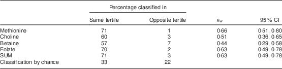 Table 3 Cross-classification analysis and κ w statistics for the 7 d EDR and FFQ tertiles of usual daily intakes of methyl-group donors among Flemish women (n 80) of reproductive age (18–35 years), February–March 2012