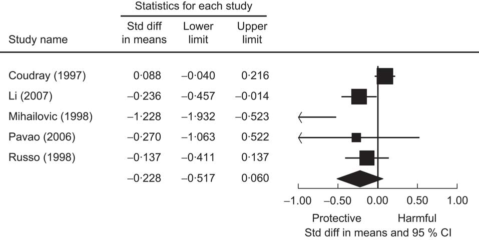 Five studies used the case–control study design and compared Se levels between hypertensive subjects and normal controls. Two studies reported significantly lower Se levels in hypertensive subjects for both males and females, one study found significantly higher Se levels in hypertensive subjects but in males only, and the other two studies found no relationship. Figure 2 presents the meta-analysis of these five studies using random-effect models. There is no overall difference in Se levels between hypertensive and normotensive subjects, as the pooled mean difference was estimated to be −0·228 (95 % CI −0·517, 0·060) μg/l.