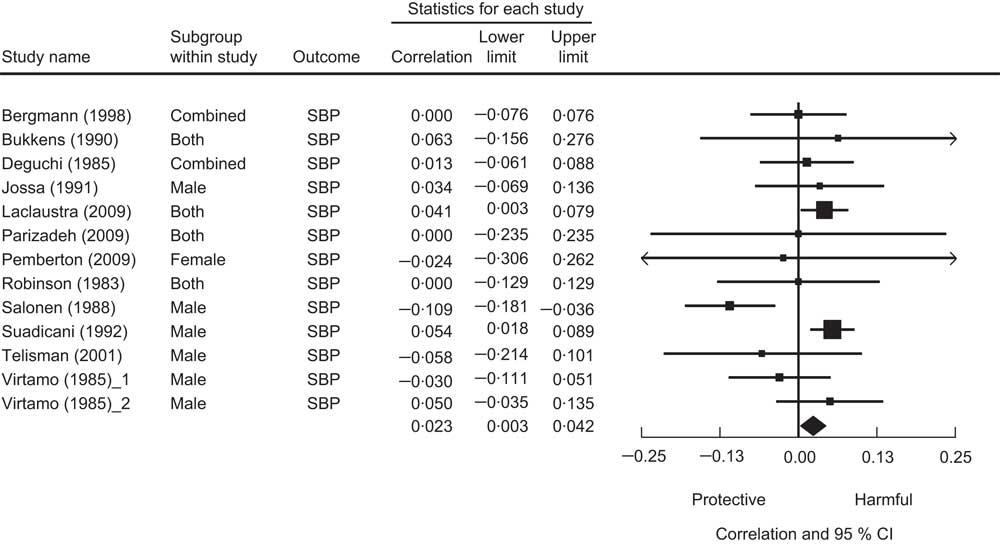 Cross-sectional analysis was used in twelve studies. Of these, nine studies found no significant association of Se with either SBP or DBP. Two studies found higher Se levels associated with higher blood pressure, while one study found the opposite relationship. We present a meta-analysis based on these cross-sectional studies in Fig. 3. The pooled correlation coefficient between Se and SBP was not statistically significant (r = 0·01, 95 % CI −0·02, 0·04).