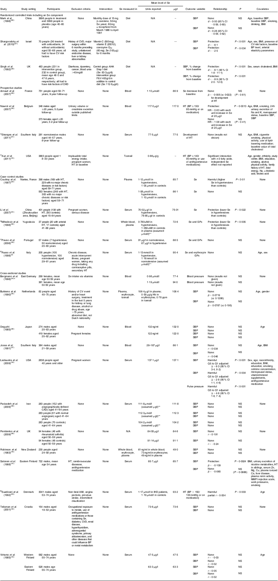 For each paper reviewed, information regarding the study setting, participant demographic information, exclusion criteria used for the study, interventional dosage for intervention studies, outcome variable and covariates were independently extracted by two reviewers (D.K. and S.G.). The level of Se measured in participants and its relationship to the outcome variable were noted. In addition, we also extracted the same information in articles that measured GPx levels. From the final multivariate model given in each paper, effect size measures, hazard ratios, parameter estimates and total or partial correlation coefficients as well as P values were recorded. The relationships were described as ‘protective’ if higher Se levels were associated with a lower risk of hypertension, ‘none’ if there was no significant relationship between Se and hypertension, or ‘harmful’ if higher Se levels were associated with a higher risk of hypertension. Statistical significance was defined as P < 0·05.