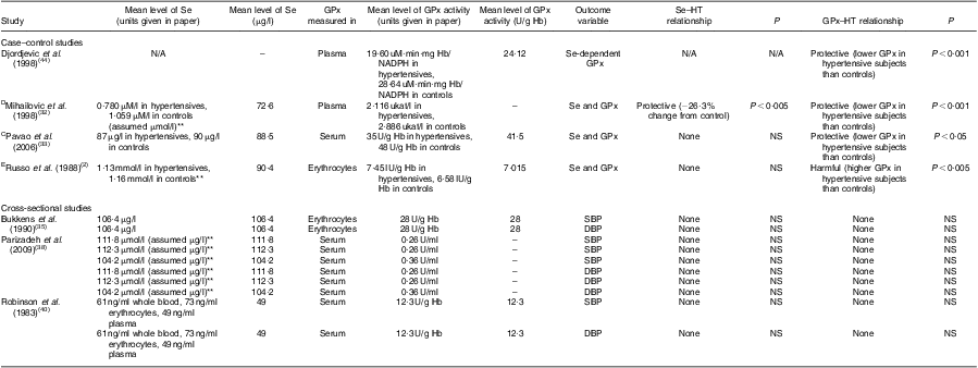 GPx, glutathione peroxidase; HT, hypertension; SBP, systolic blood pressure; DBP, diastolic blood pressure; N/A, not applicable; NS, P ≥ 0·05.