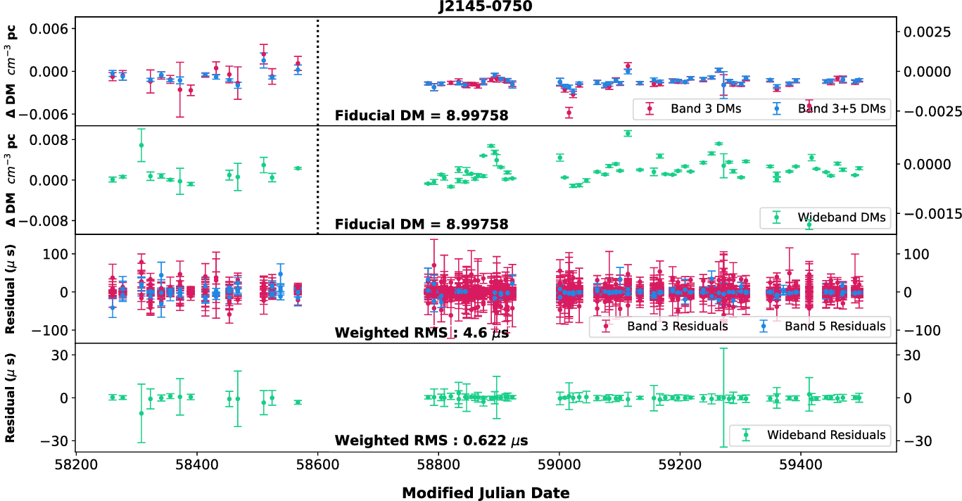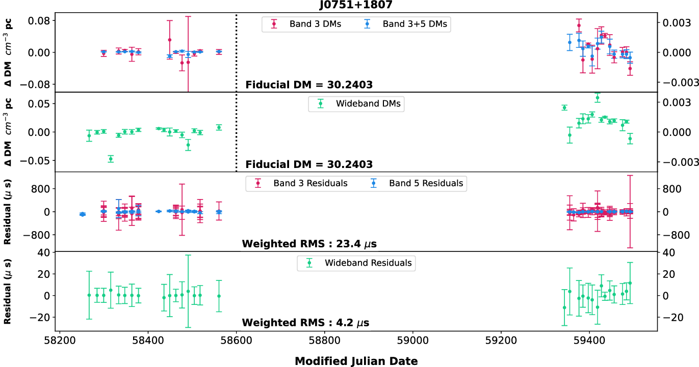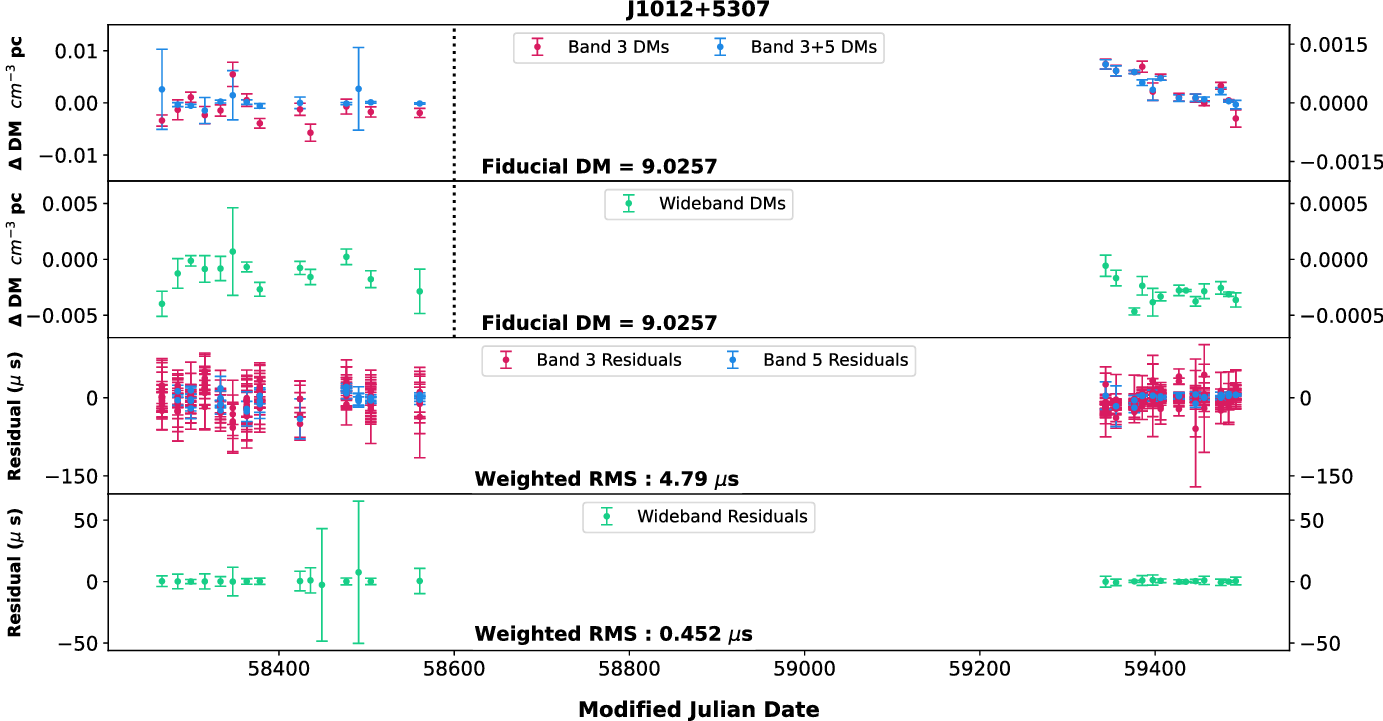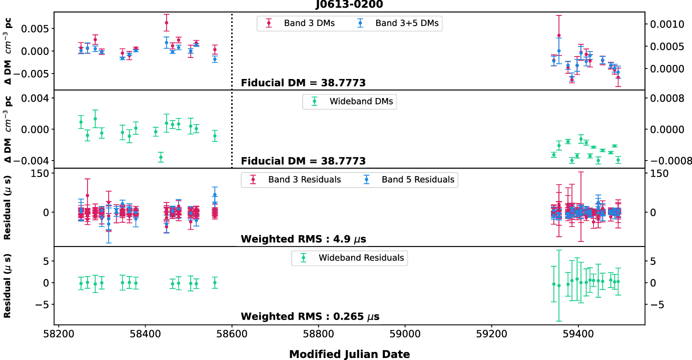 0750) for which high-S/N observations are available with 200 MHz bandwidths. Then, using wideband technique, we estimated the DM from Band 3 and Band 5 after splitting each of the bands into two 100 MHz sub-bands as well as using full Band 5 with two halves of Band 3 alone. In addition, using narrowband method, we tried four different combinations of 100 MHz portions of the data at both bands to obtain DMs. These different DM time series were compared with the DM time series shown in Figure 4. We did not find any significant difference in the DM time series (both temporal and frequency-wise) between these various combinations indicating that these pulsars may not show DM chromaticity and we can use the DMs and ToAs from Band 3 for high-precision timing. Even though this is true for the current analysis, we will be working on refining our methods in the future and try to see if any of the pulsars we observe show frequency dependence of DM.