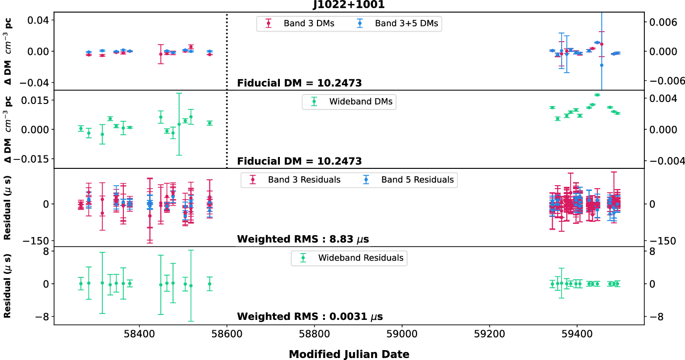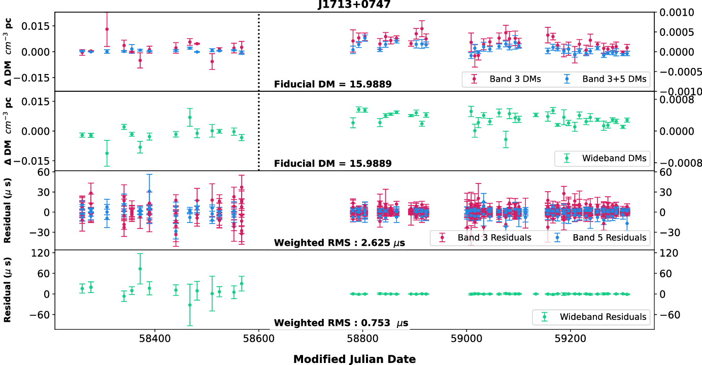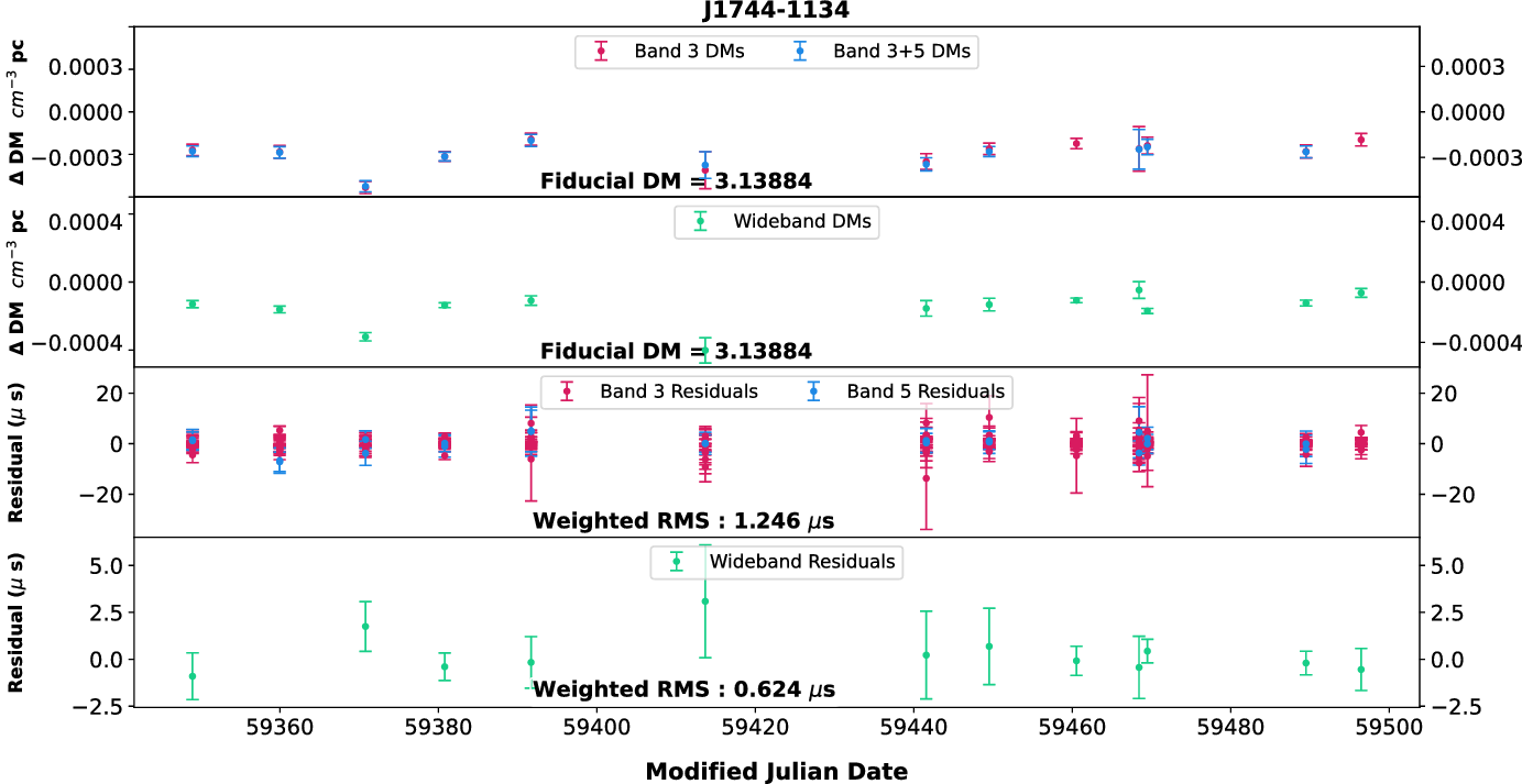 0750) for which high-S/N observations are available with 200 MHz bandwidths. Then, using wideband technique, we estimated the DM from Band 3 and Band 5 after splitting each of the bands into two 100 MHz sub-bands as well as using full Band 5 with two halves of Band 3 alone. In addition, using narrowband method, we tried four different combinations of 100 MHz portions of the data at both bands to obtain DMs. These different DM time series were compared with the DM time series shown in Figure 4. We did not find any significant difference in the DM time series (both temporal and frequency-wise) between these various combinations indicating that these pulsars may not show DM chromaticity and we can use the DMs and ToAs from Band 3 for high-precision timing. Even though this is true for the current analysis, we will be working on refining our methods in the future and try to see if any of the pulsars we observe show frequency dependence of DM.