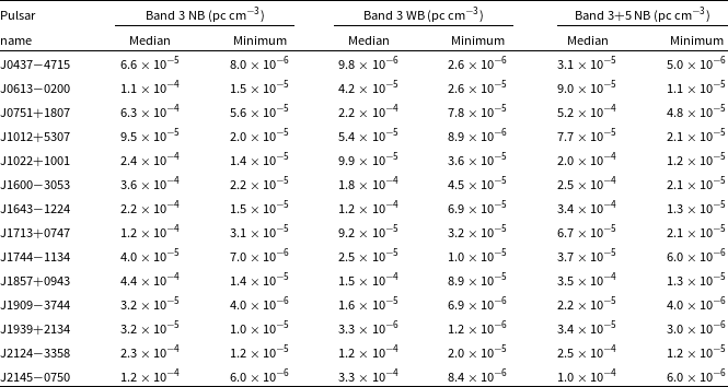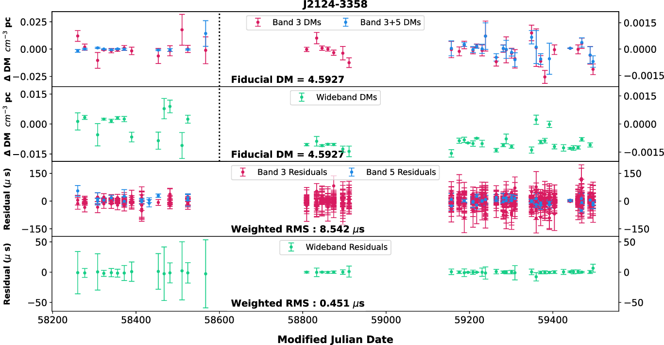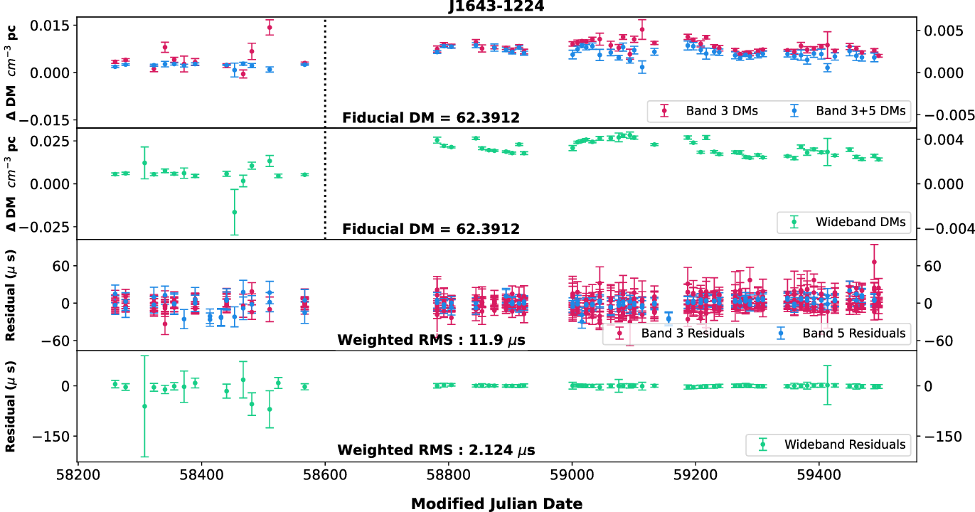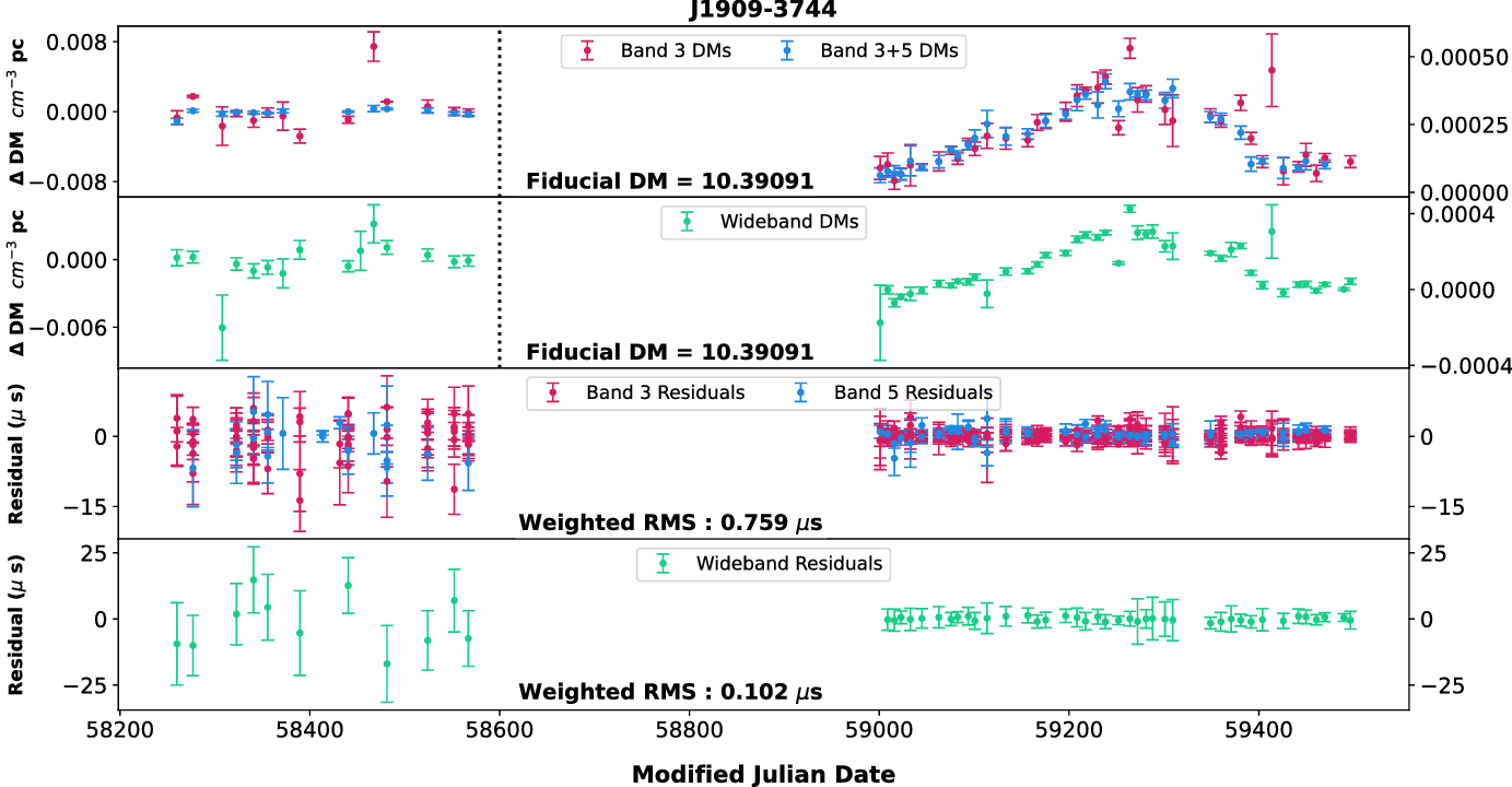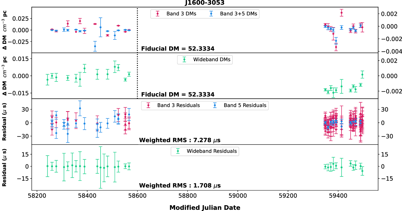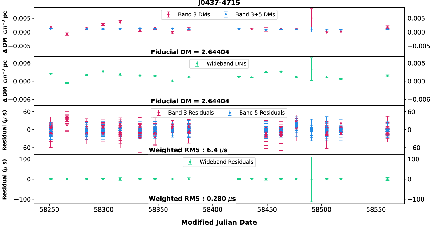 As we have two widely separated bands (with wide bandwidths), we used both narrowband and wideband techniques for estimating the DMs using different combinations. We chose a set of pulsars (J0437