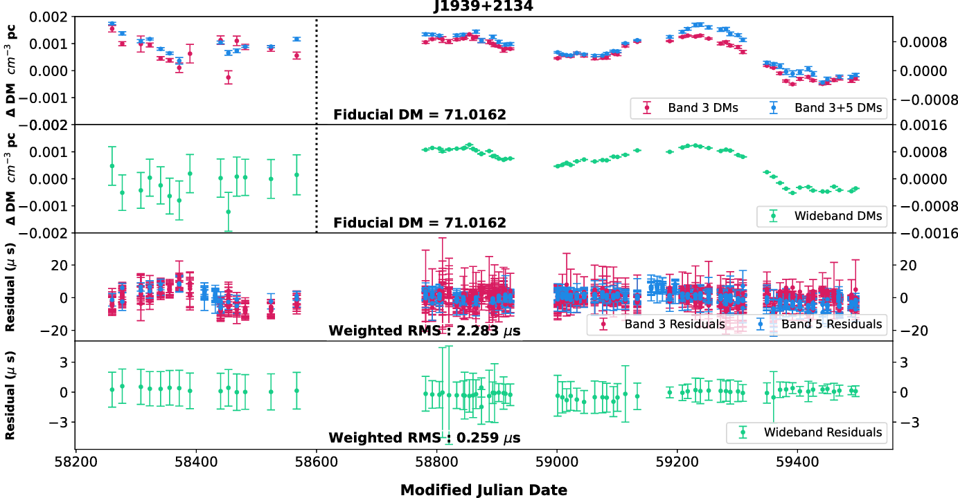 DM variations visible. Narrowband and wideband timing residuals are shown in the two bottom panels. Fiducial DMs and post-fit weighted RMS residuals are mentioned at the bottom of the respective panels.