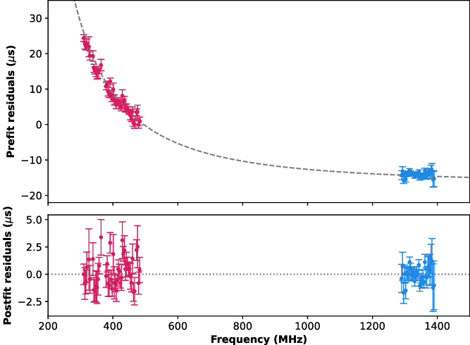 The small-scale electron density variations in the ISM will scatter the rays resulting in multi-path propagation. It was suggested by Cordes, Shannon, & Stinebring (Reference Cordes, Shannon and Stinebring2016) that this will affect the ToAs at higher frequencies while combining them with lower frequency ToAs as this chromatic effect depends strongly on the observing frequency. Using low-frequency observations, it was shown by Donner et al. (Reference Donner2019) that the DMs are different even within about a bandwidth of 70 MHz at low frequencies and vary over several years. In a recent study by Kaur et al. (Reference Kaur2022), a possible PTA candidate PSR J2241