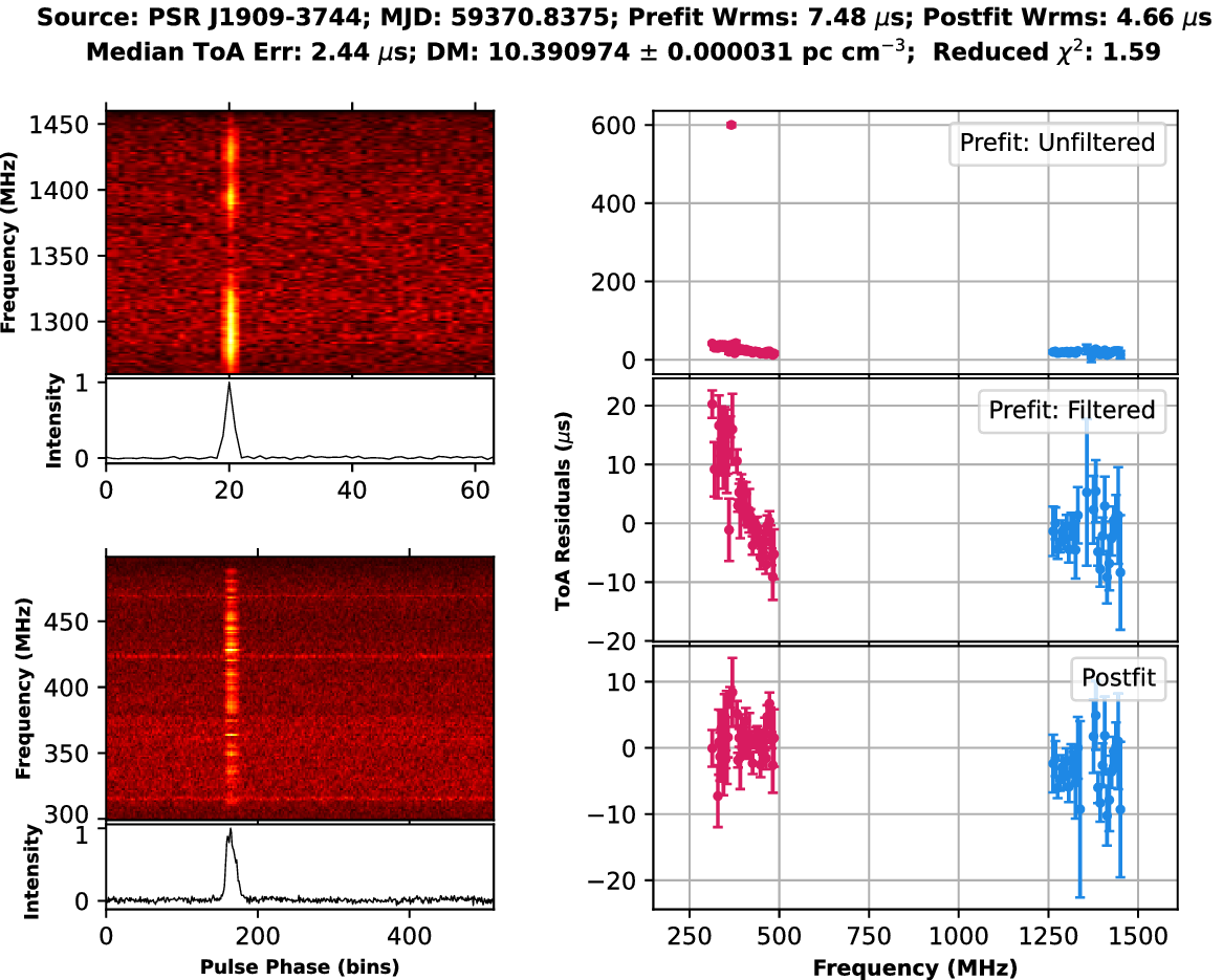 All profiles are pre-processed by time-collapsing and applying frequency offset correctionsFootnote c before ToA and DM estimations. Additionally, backend delays introduced by the GWB that depend on the observation settings, described in Reddy et al. (Reference Reddy2021), must be corrected for to achieve high-precision timing. These corrections are incorporated in the PSRFITS archive headers using the be:delay field.Footnote d The pat and pptoa commandsFootnote e apply the appropriate corrections to the ToAs generated from such archives.
