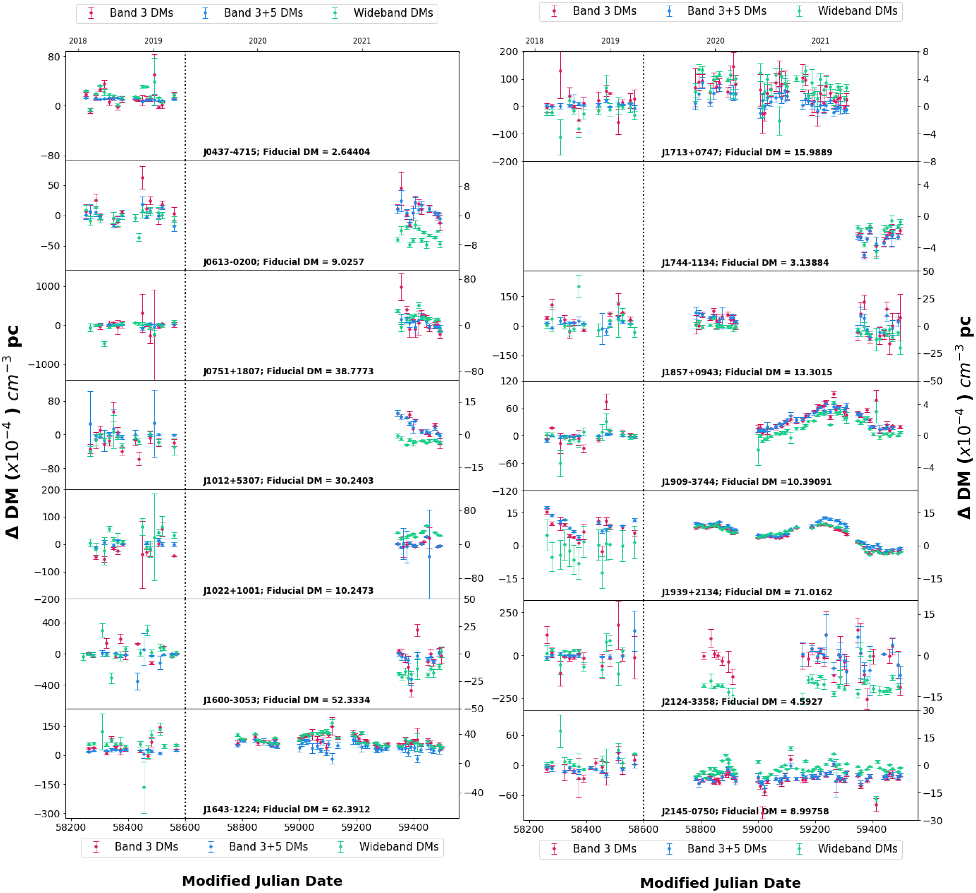 pc) between the fiducial DM and the corresponding estimated DMs for each pulsar estimated by (i) fitting only Band 3 narrowband ToAs (red points), (ii) fitting Band 3 and Band 5 narrowband ToAs together (blue points) and (iii) by applying the wideband technique on Band 3 data (green points), are overlaid for comparison. The values depicted on the vertical axis are DMs relative to the fiducial DMs for the respective pulsars that are obtained using the iterative method described in Section 4.1.1. Since the precision of DM estimation from 200 MHz bandwidth data is higher than that from 100 MHz bandwidth data, the horizontal axes are split into two parts at MJD 58600 with dotted vertical lines, where epochs on the left side of the dotted line in each panel represent 100 MHz bandwidth, and epochs on the right side of the dotted vertical lines in each panel represent 200 MHz bandwidth. The vertical axes in each panel are also scaled differently for 100 MHz bandwidth (left axis) and 200 MHz bandwidth (right axis) epochs such that the DM variations are clearly visible. Pulsar names and their respective fiducial DM values are mentioned at the bottom of each respective panel. The time span in terms of the years is also denoted at the top for convenience.