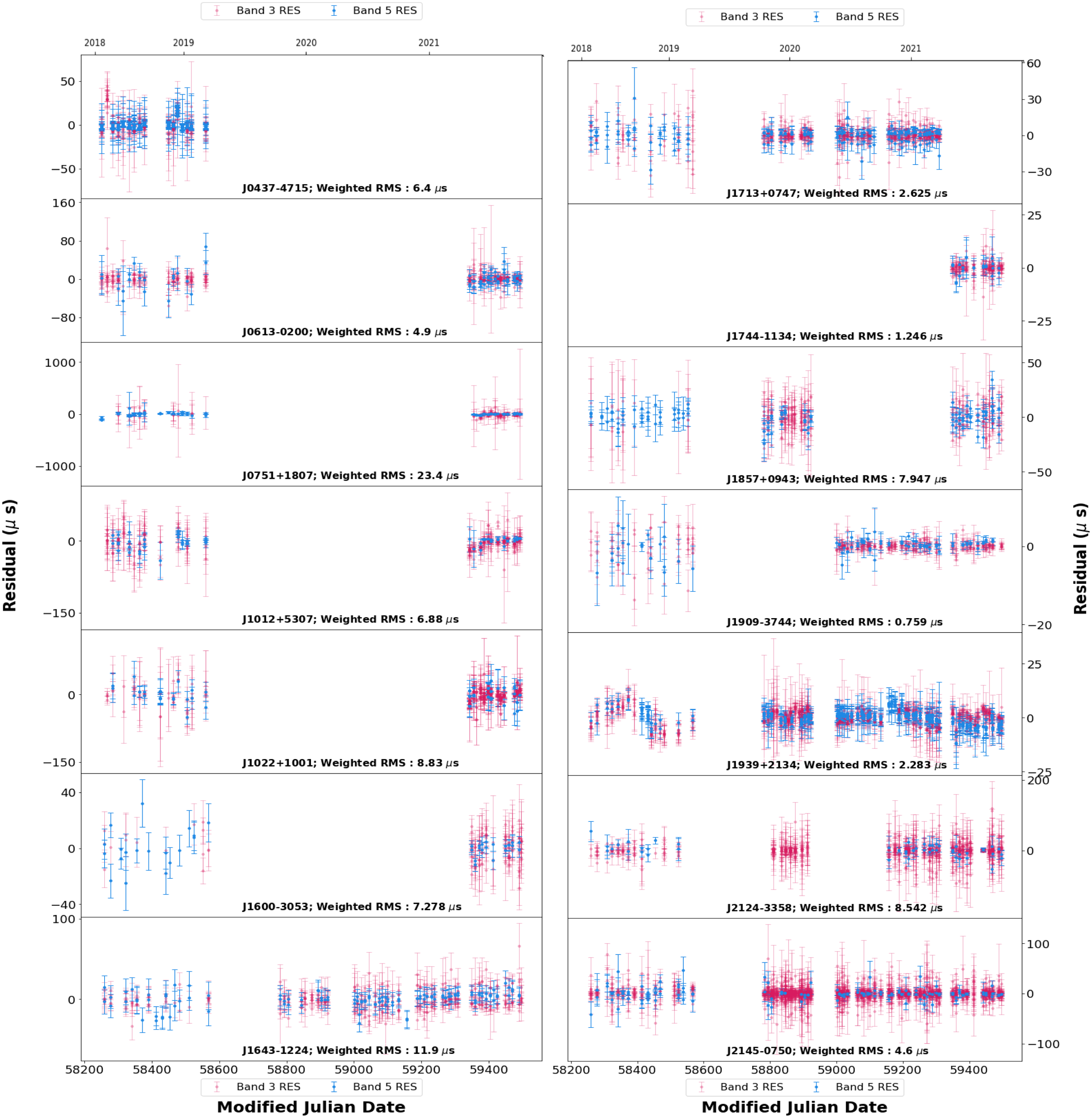 Figure 5. Narrowband timing residuals for 14 pulsars. The timing residuals obtained from Band 3 and Band 5 data using the narrowband timing technique for 14 pulsars are plotted against corresponding epochs. Red points represent Band 3 and blue points represent Band 5 residuals. Pulsar names and their respective post-fit weighted RMS residuals are mentioned at the bottom of the respective panels. Epochs in terms of Modified Julian Date are depicted on the consolidated horizontal axes at the bottom. The corresponding years are also shown on the horizontal axes at the top of the consolidated panels for convenience.