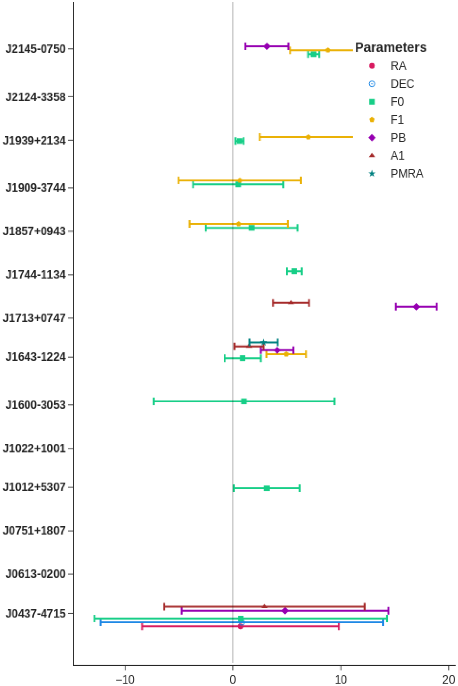 Figure 6. Comparison of fitted pulsar parameters obtained with narrowband and wideband timing. The parameter differences have been normalised using the quadratic sum of the two errors (