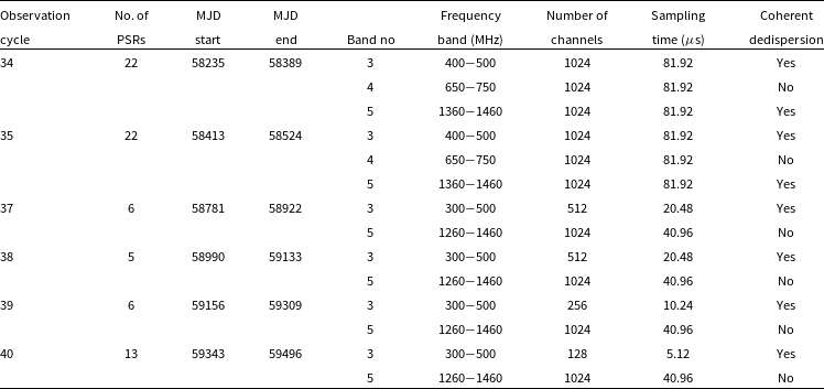 40) due to an offset in the local oscillator frequencies in all bands at the observatory during these epochs. PSRs were observed on MJDs 58413 and 58431 (Cycle 35) with a bandwidth of 200 MHz (standard bandwidth for cycles 34 and 35 was 100 MHz). Band 5 data between MJDs 58411 and 58436 (Cycle 35) were not recorded with coherent dedispersion. MJDs 59376 and 59380 (Cycle 40) were non-standard observations with the Polyphase Filterbank (PFB) setting turned on (PFB is turned off for all our observations in general).