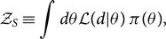 (10) \begin{align}\mathcal{ Z}_S & \equiv \int d\theta \mathcal{ L}(d | \theta) \, \pi(\theta),\end{align}