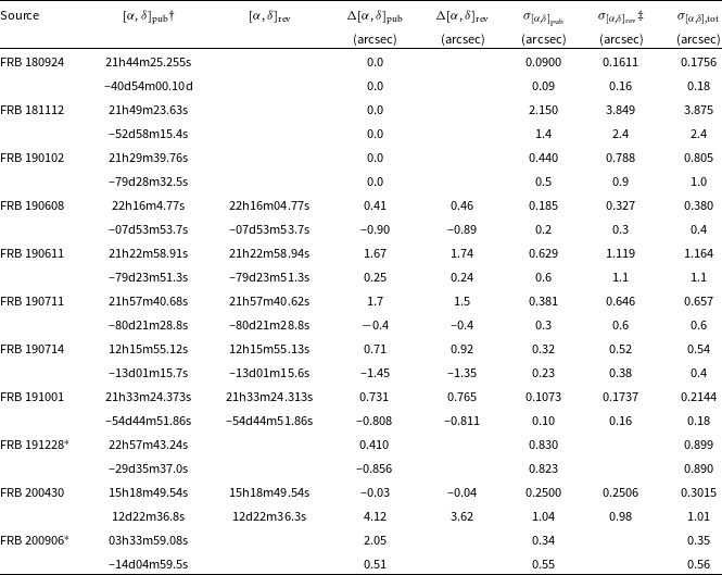 0.98). We note that the RA is unchanged from the previously published value (Table 3) at the quoted precision. Given the significant impact on the final position of the frequency-dependent offset observed for this FRB, all future FRBs, especially those at low frequencies, should be inspected to determine if such offsets exist in the data.