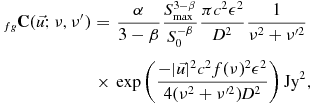 _{fg}{\bf C}(\vec{u};\nu ,\nu ^\prime ) &=& \frac{\alpha }{3-\beta }\frac{S_{\rm max}^{3-\beta }}{S_0^{-\beta }}\frac{\pi {c^2}\epsilon ^2}{D^2} \frac{1}{\nu ^2 + \nu ^{\prime {2}}}\nonumber \\