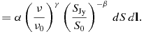 where ε = 0.42 converts an Airy disk to a Gaussian characteristic width, D is the station diameter, and f(ν) = (ν − ν′)/ν0. The point source model is represented by a broken power-law, characterised by parameters α, β, such that in a sky area d l:
