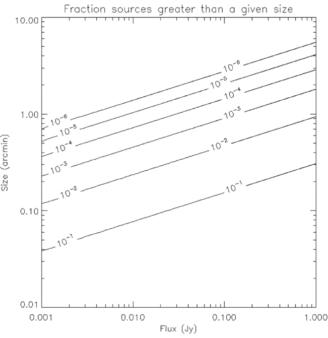 where ψ m = 2.0S 0.3 1.4 arcsec is the median size at 1.4 GHz. We scale the flux densities to 150 MHz to find the corresponding median size for low frequencies. Figure 2 shows this fraction as a function of flux density and size. Strictly this distribution is applicable for flux densities below 1 Jy: the extended, close radio galaxies (e.g., Fornax A, Centaurus A, Pictor A), which have much larger flux densities, have their own individual spatial and spectral distributions. Assuming a point source number count distribution, a field-of-view and this fraction, the number of sources larger than a given angular size and greater than some flux density limit can be approximated as
