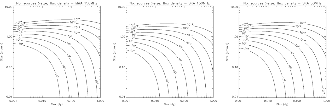 Figure 3. Number of sources with angular extent and flux density greater than given values for the MWA 150 MHz (left), SKA 150 MHz (centre), and SKA 50 MHz (right) experiments.