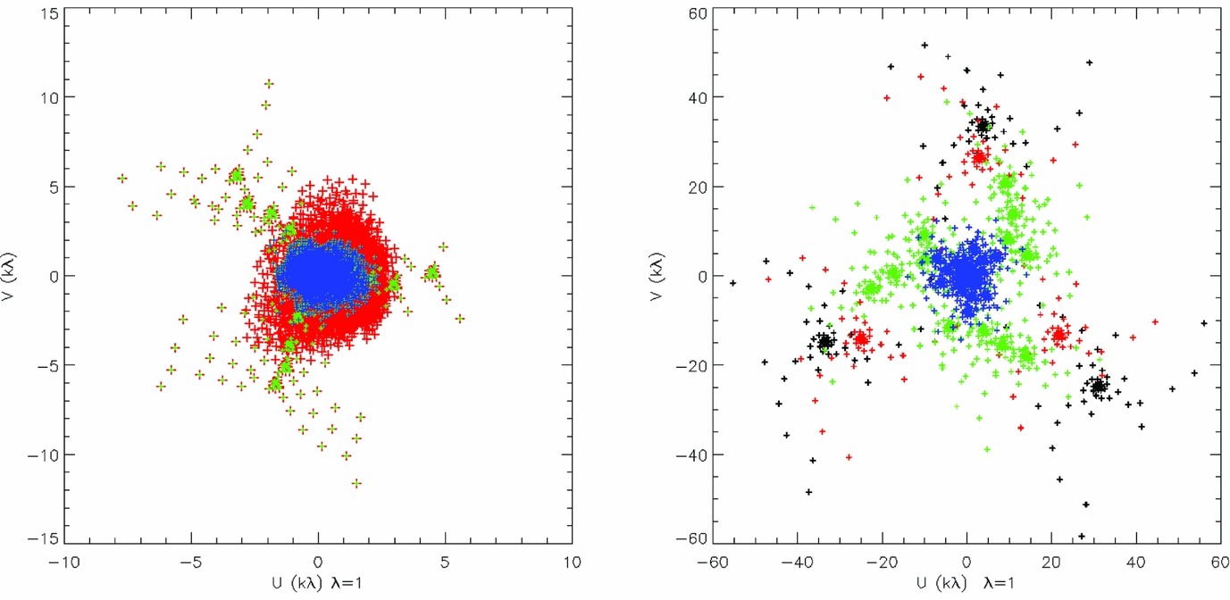 Figure 4. (Left) uv coverage for a zenith snapshot pointing for the three MWA arrays: MWA Phase I (blue), +GMRT (green), MWA Phase III + GMRT (red). (Right) uv coverage for a zenith snapshot pointing for the four SKA1 arrays considered: black (max. baseline 65 km), red (49 km), green (39 km), blue (14 km), (λ = 1 m).