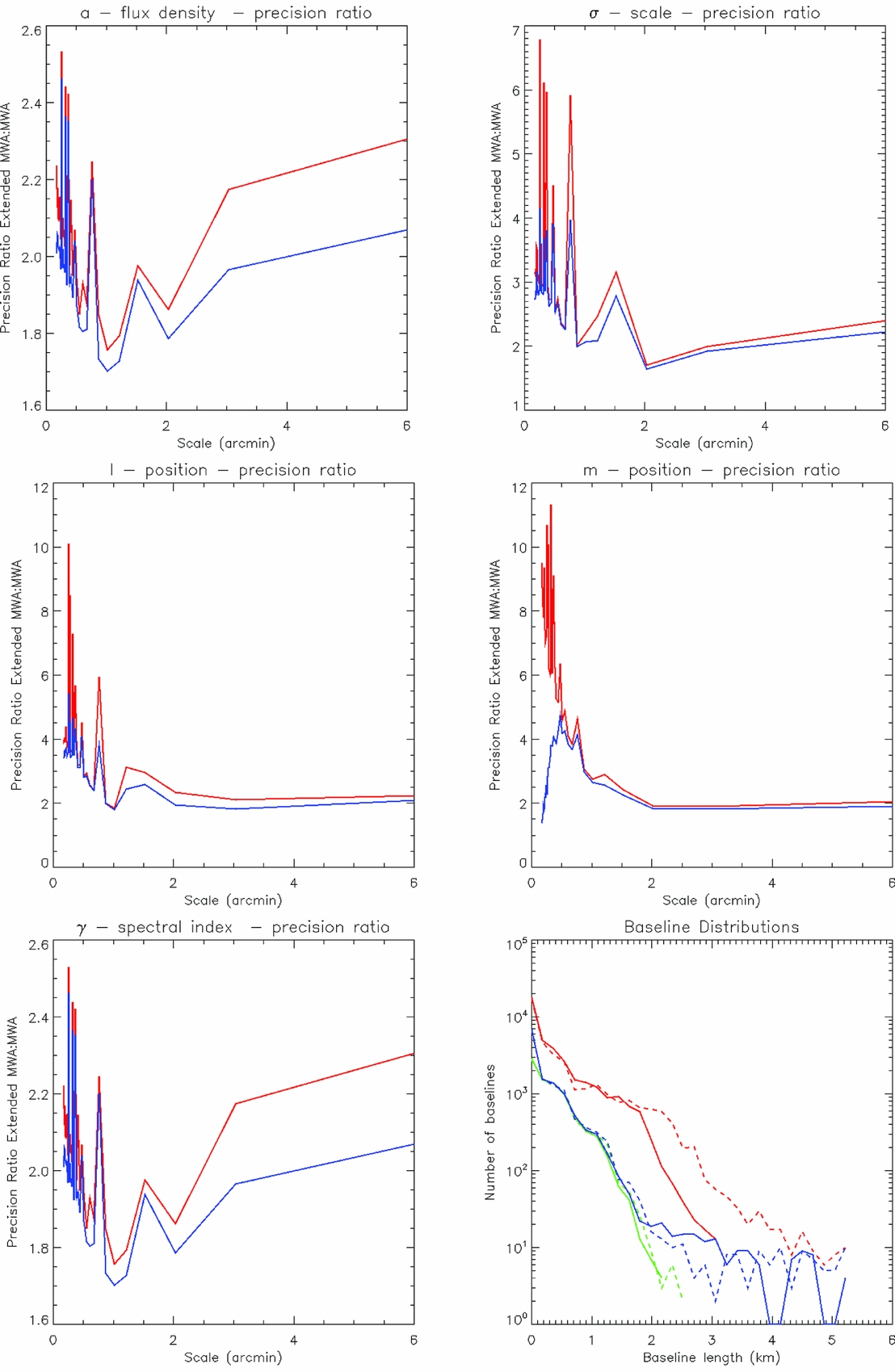Figure 6. (Top, middle, bottom left) Ratio of estimation performance (precision) for extended MWA (256 tiles + TGSS) relative to the original MWA128 (red) and MWA128 + TGSS (blue), as a function of scale of source feature. (Bottom right) Histograms of baseline distributions in u (solid) and v (dashed) directions for MWA256 + TGSS (red), MWA128 + TGSS (blue), and MWA128 (green).