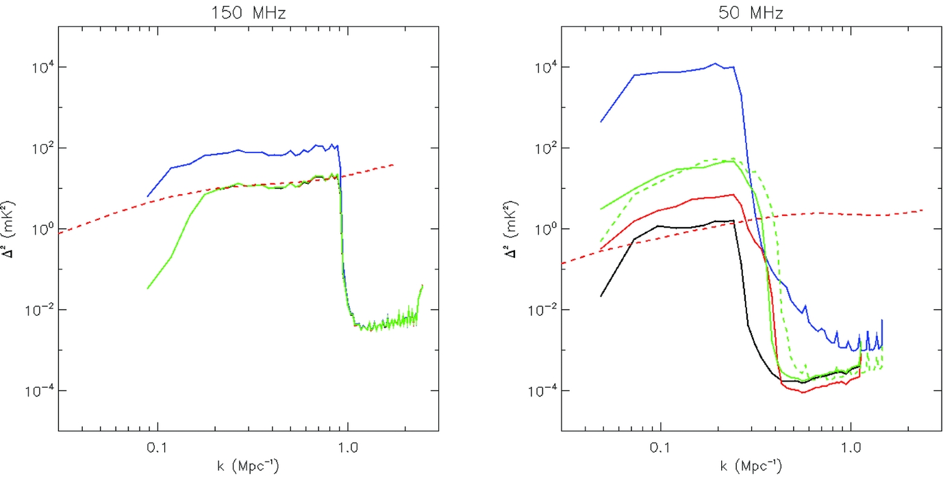 Figure 9. (Left) 150 MHz spherically-averaged power spectrum and simulated 21cmFAST 21 cm power for comparison (dashed). 14 km (blue), 39 km (green), 49 km (red), 65 km (black). Note that the black, red and green are overlapping. (Right) Same but for 50 MHz, including an alternative array configuration with 39 km baselines (green, dashed).