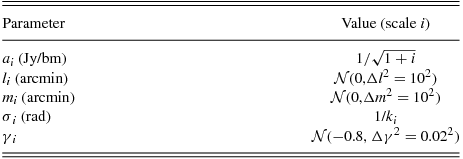 We want to form the most general extended source, in order to provide a fair basis for comparison. We aim to build a model with multi-scale structure that encases the spatial modes accessible to the Baseline Design SKA1-Low, corresponding to scales of the synthesized beam (10 arcsec at 150 MHz) to a fraction of the field-of-view (0.08º). We build a model with a complete set of angular scales, spaced evenly in the range k = [570–17 000] rad−1, and construct a source based on the summation over a series of Gaussians, each with five parameters: central location l i , m i (rad), peak brightness S i (Jy/beam for SKA-Low beam at 150 MHz), characteristic scale σ i (rad), and spectral index γ i . This corresponds to 57 angular scales (k = [570–17 000] rad−1, sampling evenly at a spacing of half of the lowest k-mode), yielding 285 total parameters. The parameters for each scale are generated via a Gaussian-distributed random sampling, as described in Table 1, and fixed thereafter for each array configuration. The Fourier-space expectation of the signal (μ in Equation 1) is given by