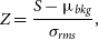 Z= \frac{S-\mu_{bkg}}{\sigma_{rms}},