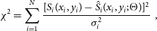 \begin{equation}\chi^{2}= \sum_{i=1}^{N} \frac{[S_{i}(x_i,y_i)-\skew3\hat{S}_{i}(x_i,y_i;\Theta)]^{2}}{\sigma_{i}^{2}}\;\;,\end{equation}