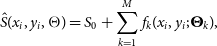 \skew3\hat{S}(x_i,y_i,\Theta)&= S_{0} + \sum_{k=1}^{M}f_{k}(x_i,y_i;\boldsymbol\Theta_{k}),\end{align}