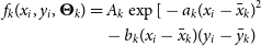 f_{k}(x_i,y_i,\boldsymbol\Theta_k)&= A_{k}\exp[-a_{k}(x_i-\skew1\bar{x}_{k})^{2}\nonumber\\ & \quad- b_{k}(x_i-\skew1\bar{x}_{k})(y_i-\skew1\bar{y}_{k})\end{align}