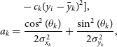 \begin{align} &\quad- c_{k}(y_i-\skew1\bar{y}_{k})^{2}], \\ a_k&= \frac{\cos^{2}(\theta_k)}{2\sigma_{x_k}^{2}} + \frac{\sin^{2}(\theta_k)}{2\sigma_{y_k}^{2}},\end{align}