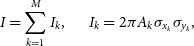 I=\sum_{k=1}^{M}I_{k},\;\;\;\;\;\;\;I_{k}=2\pi A_{k}\sigma_{x_k}\sigma_{y_k},