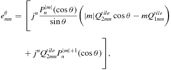 e_{mn}^{\theta }& =& \Bigg [j^{n}\frac{P_{n}^{|m|}(\cos \theta )}{\sin \theta }\Big(|m|Q_{2mn}^{tile}\cos \theta -mQ_{1mn}^{tile}\Big ) \nonumber\\