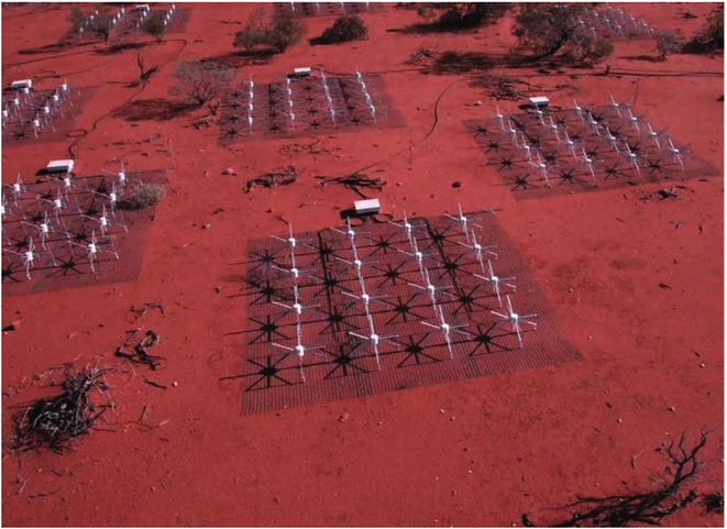Figure 1. Examples of the MWA’s aperture array antenna ‘tiles’, each comprised of a 4 × 4 grid of individual bow-tie dipoles (Image credit: MWA Project, Curtin University).