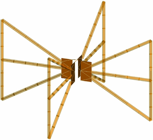 Figure 2. The bow-tie antenna modelled in feko. The marks along the arms indicate the simulation segments.