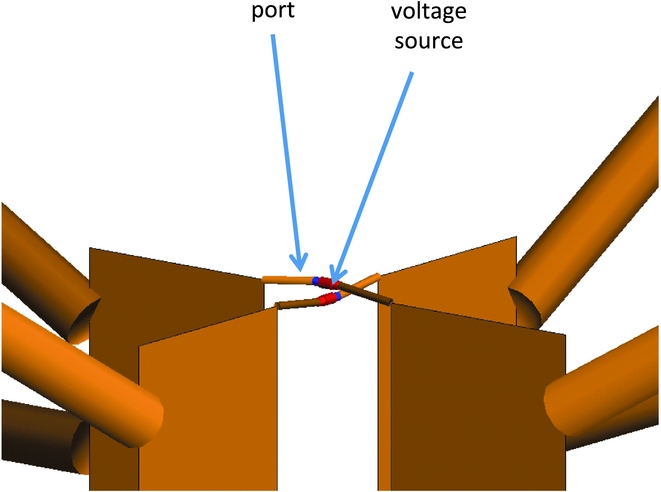 Figure 3. Bow-tie ports modelled in feko, where the ports are loaded with a voltage source.
