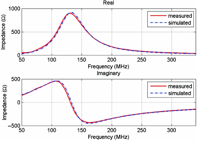 The model uses loaded ports as shown in Figure 3. The low noise amplifier (LNA) impedance is modelled using a lumped circuit, meaning the complex characteristics of the LNA impedance is predictable by measuring a simple shunt-series elements made up of resistors, inductors and capacitors (RLC). We represent the LNA input impedance with a 2 nH series element attached to a RLC (914 Ω, 450 nH, and 3.2 pF) shunt network. As per Figure 4, this model shows good agreement with the LNA impedance measured using a vector network analyser. The lumped circuit model results in a more compact, self-contained simulation file, and returns an impedance at arbitrary frequency resolution.