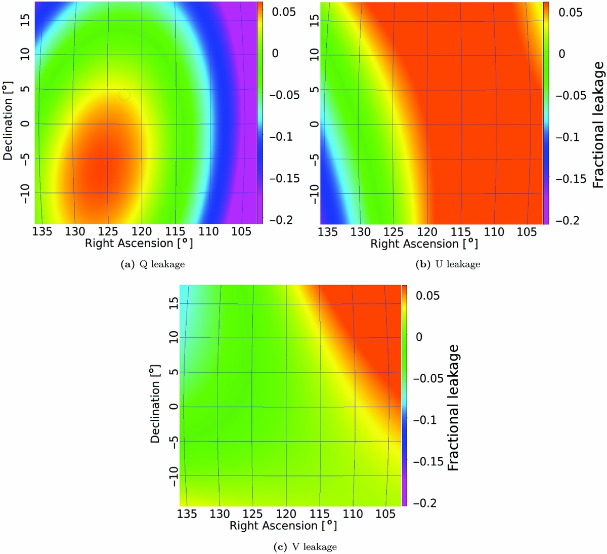 The GLEAM survey identified that the ratio of YY/XX flux densities deviates from unity away from the pointing centres and has a declination-dependent structure as shown in Figure 4 in Hurley-Walker et al. (Reference Hurley-Walker2017) and Figure 11 in the current paper (only the data >200 MHz). The effect was reduced, but still noticeable, by the mosaicking procedure which up-weighted (by square of the beam pattern E 2) the measurements taken closer to the beam centre (local meridian). Using the YY/XX ratios observed in GLEAM, we calculated the equivalent in terms of false Stokes Q, which is in a range of approximately 5–20%.