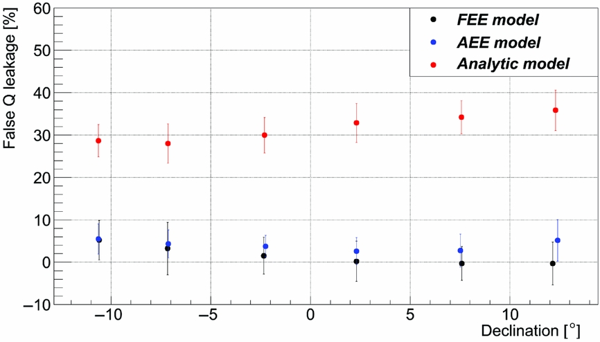 Figure 7. Comparison of Stokes Q leakage measured in images at 200–231 MHz calibrated with the three different models. The leakage data from individual sources were averaged in 5° bins (100–200 sources per bin). The analytic model performs the worst of all three models. The FEE models performs better at positive declinations and converges to AEE model at negative declinations (both are within measurements errors on this relatively small data sample).