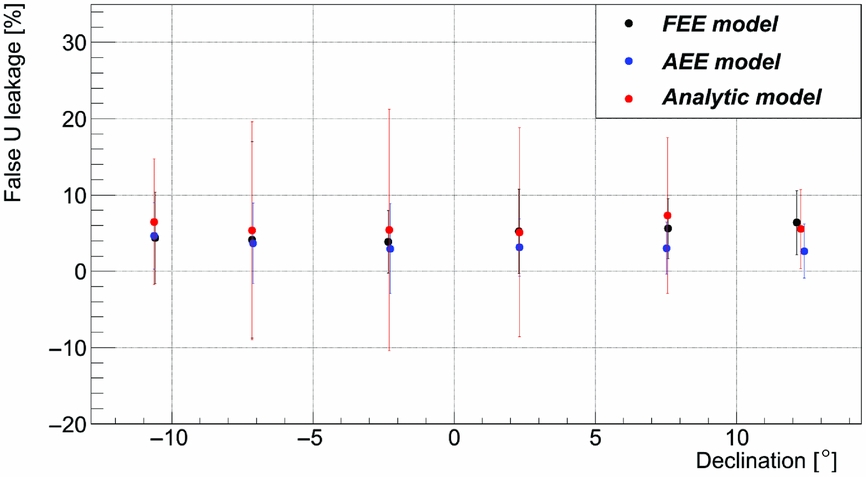 Figure 8. Comparison of Stokes U leakage measured in images at 200–231 MHz calibrated with the three different models. The leakage data from individual sources were averaged in 5° bins (100–200 sources per bin). All three models have similar values of the U leakage ≈5%. Note that the errors of false Stokes U for the analytical model are significantly larger than for the FEE and AEE models (Figure 8) because the hour angle dependence of false Stokes U was reduced significantly for the non-analytic models.