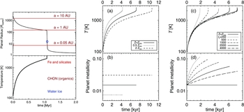 While some of the CA population synthesis models also predict no strong correlation between core-dominated planets and the host star metallicity (e.g., Mordasini et al. Reference Mordasini, Alibert, Benz and Naef2009b), the degeneracy between the two models may be broken in two areas. Tidal Downsizing predicts that massive core formation is a very rapid process, even at ~ 100 AU, requiring less than ~ 105 yrs (Nayakshin Reference Nayakshin2016b), whereas CA takes