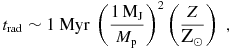 Super-migration. Numerical simulations (Section 4.2) show that gas clumps born by gravitational instability ‘super-migrate’ in, that is, their separation from the star may shrink from a ~ 100 AU to arbitrarily close to the star, unless the disc dissipates earlier. The migration time t mig is from a few thousand years to a few × 105 yrs at late times when the disc mass is low.