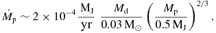 where q −3 = 1000M p/M * is the planet to star mass ratio scaled to 0.001, a 2 = a/100 AU, and Γ is a dimensionless factor that depends on the disc surface density profile and thermodynamical properties (Γ is the modulus of equation (6) in Baruteau et al. Reference Baruteau, Meru and Paardekooper2011). Simulations show that Γ ~ a few to ten for self-gravitating discs, typically.
